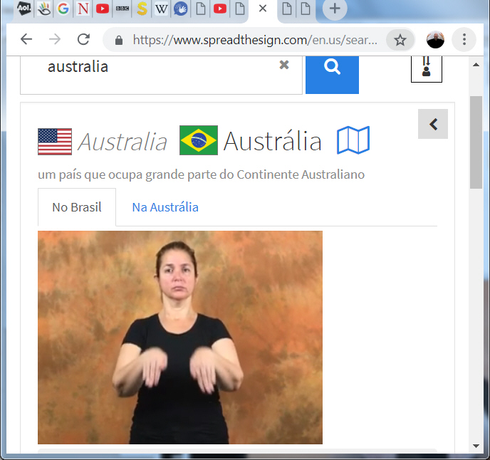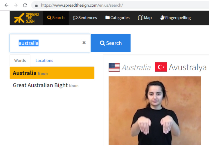 (Source: Australia/Australian search result from "The Auslan Dictionary," Signbank. Retrieved 1/19.2019 from: http://www.auslan.org.au/dictionary/words/Australia-1.html ) (Licensed under Creative Commons BY-NC-ND 4.0.)
