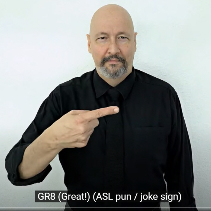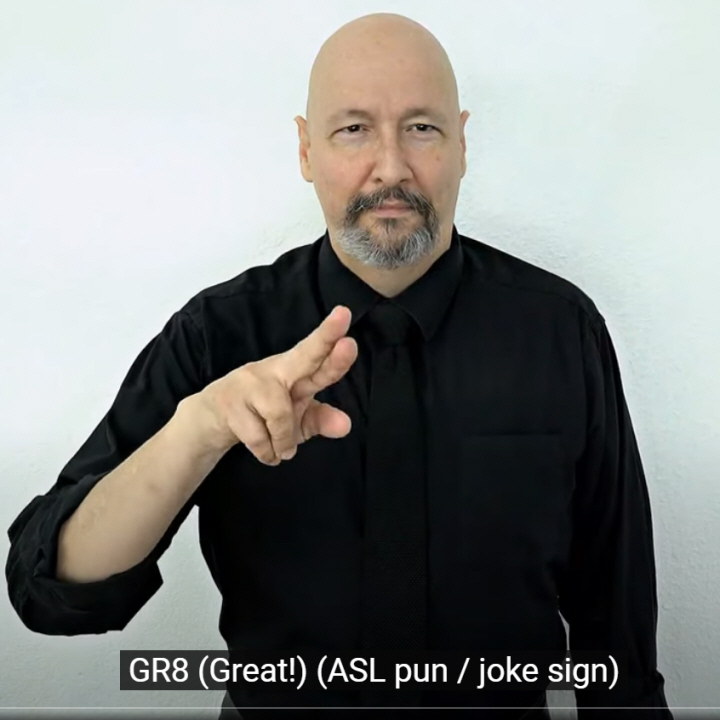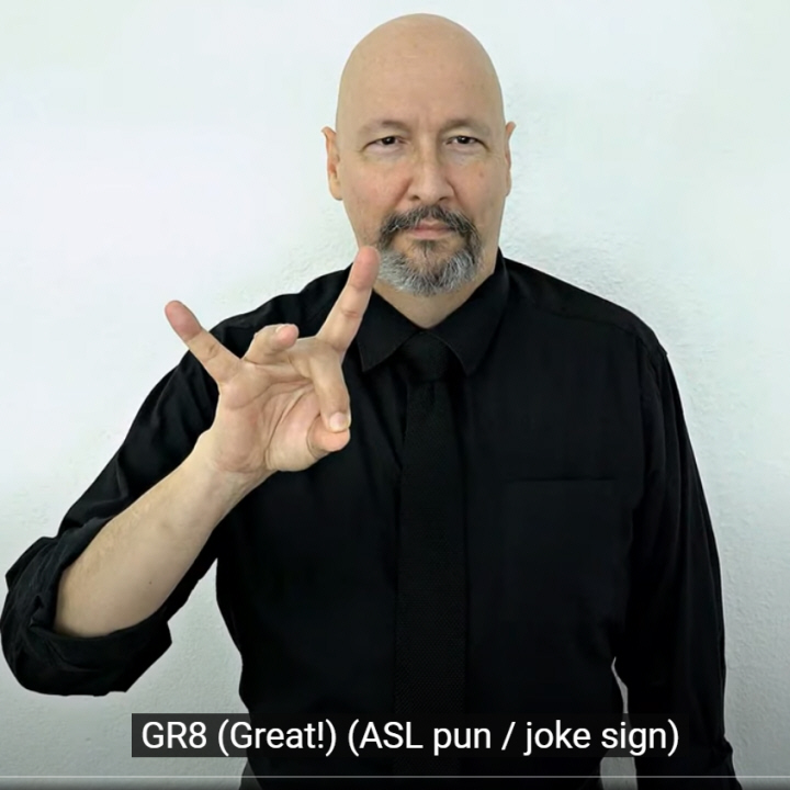 The GR8 protologism (or perhaps "neologism") was brought to my attention in March of 2024 by one of my interns who saw it during their day job as an interpreter when one of their Deaf clients signed it to them at the completion of an assignment to wish them a "GR8 DAY!"