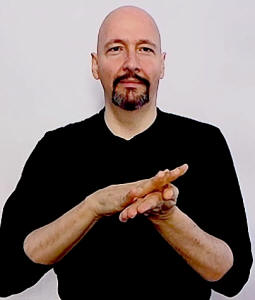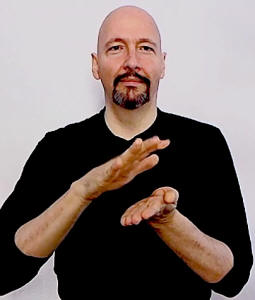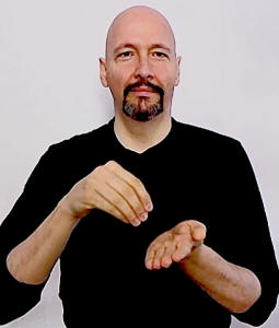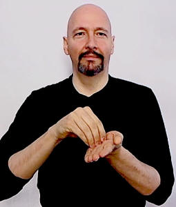hold out your non-dominant flat hand, palm up. Make an "X-hand" with your